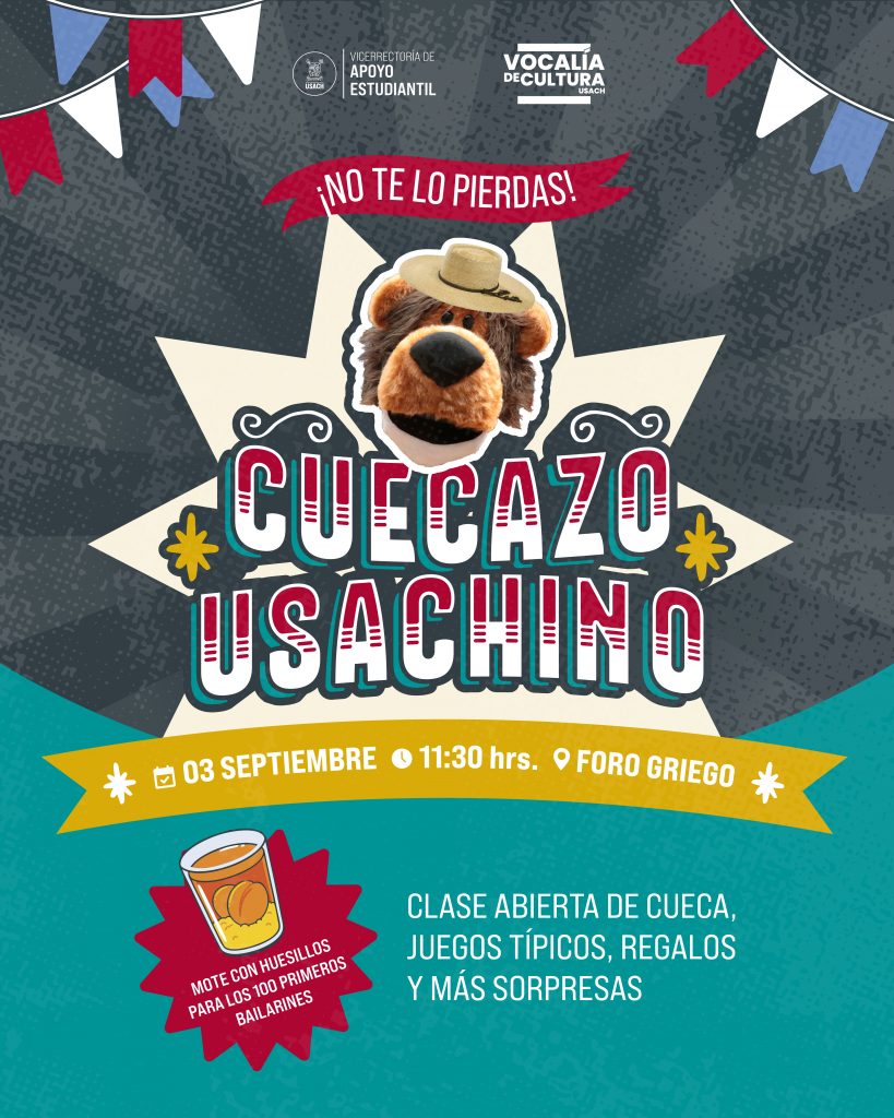 Con el compromiso de fortalecer la vida universitaria a través de espacios culturales de encuentro y participación, la Universidad de Santiago celebrará la segunda edición del Cuecazo Usachino, actividad que invita a toda la comunidad de nuestra Casa de Estudios a disfrutar de una mañana de música en vivo, juegos típicos y una clase abierta de cueca, dirigida por el profesor Luis Maldonado Vargas, director general y artístico del BAFUSACH. La jornada se realizará el miércoles 3 de septiembre a las 11:30 hrs. en el Foro Griego, y contará con sorpresas y premios para quienes participen.